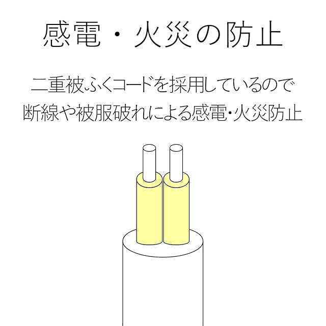 電源コードには、社団法人日本配線器具工業会規格(JWDS0010)に適合した二重被ふくコードを採用していますので、断線や被ふく破れによる感電・火災の防止に有効です。