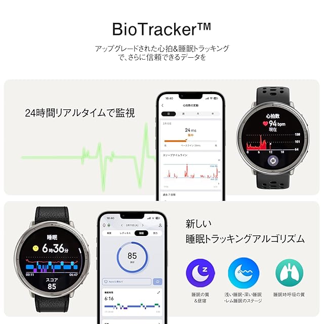 【グレードアップした健康関連センサーとアルゴリズム】新搭載のBioTracker 6.0 PPG バイオセンサー(5PD +2LED) は、新しい心拍数および睡眠追跡アルゴリズムと連携して、高い精度で重要な健康データを記録します。また、毎日のレディネススコアを取得して、精神的および身体的回復を把握し、状態に合わせて最適な1 日を過ごすのに役立つ実用的なガイダンスも取得出来ます。