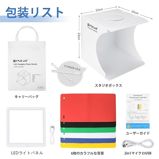 商品名:PULUZ 20cm撮影ボックス+LEDシャドーレスランプパネル 撮影キット 、アクリル素材、背景布6色付属 ボタン式 組立簡単 折り畳みポータブルソフトボックス 小物撮影 スタジオ撮影テントボックス 照明範囲 20cm x 20cm サイズ:23*24*23cm (20cm撮影ボックス+ライトパネル)