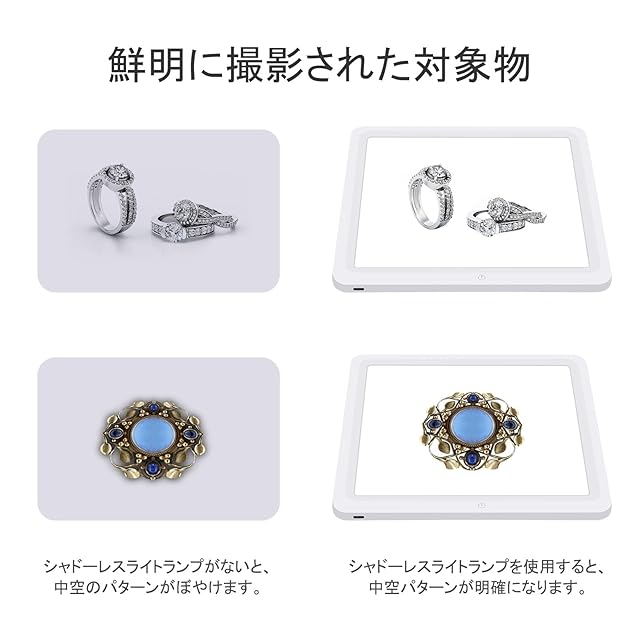 【シャドウレスランプパネル】シャドーレスパネルは、影の問題を完全に取り除き、製品の輪郭とエッジをシャープにし、写真編集時間も大幅に削減します。照明効果がより素晴らしいし、点滅も全然ありません。撮影ボックスにシャドーレスパネルを入れて、より素敵な効果があります。