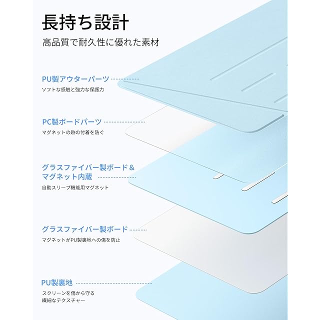 【マルチアングルデザイン】:2つのスタンドモードに対応しており、45°~60°はビデオ鑑賞、作業、FaceTimingなどに最適なビューイングモードへと、25°に調節した場合は執筆、絵画、その他のクリエイティブな作業に最適なライティングモードへと用途に合わせて角度調節が行えます