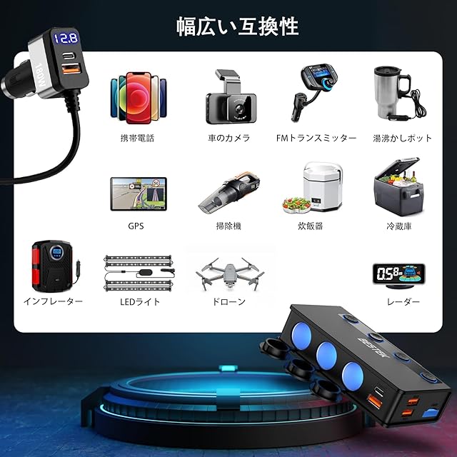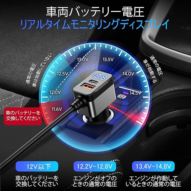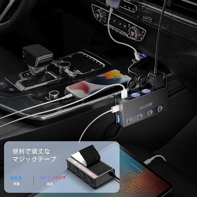 使いやすいオン/オフスイッチ: 各USBポートには独立したオン/オフスイッチがあり、デバイスを他に影響を与えずに自在に制御できます。さらに、LED電圧表示モニターが車のバッテリー電圧をリアルタイムでチェックします。
