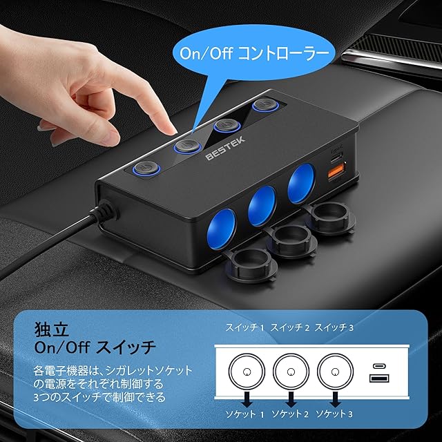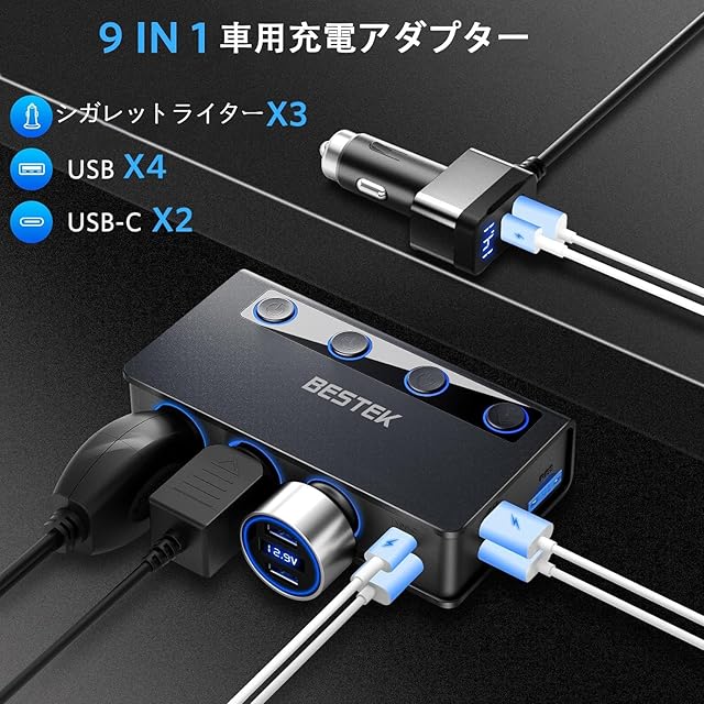 BESTEK 180Wシガーライター分配器は、あなたの車のシガーライターを拡張し、最大3つのソケットを提供します。これにより、GPS、ダッシュカム、掃除機、冷蔵庫、シートヒーターなど、高出力の自動車機器を含む最大9台のデバイスを同時に充電できます。PD36W/65W高速充電とQC3.0の急速充電ポートが付いており、効率的に充電することが可能です。この製品があれば、長時間のドライブでも安心して多くのデバイスを使用できます。 コードの長さ:約83cm