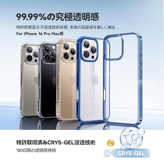 【極々透明感・本体の高級感満喫】高透明度ダイヤPC素材を厳選採用、iPhone 16 Pro Max本来の美しさを損なわなず、高級感を思い存分楽しめる!さらに素材の芯まで最新耐黄変技術「CRYS-GEL」分子を浸透する事でクリアケースのよくある変色劣化を徹底解消