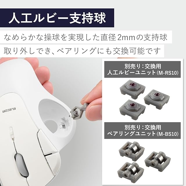 支持ユニットに直径2mmの人工ルビーを採用。従来品よりも自然でなめらかな操球を実現しました。支持ユニットは簡単に取り外し可能で、人工ルビーはもちろん、ベアリングにも交換可能です。※交換用の人工ルビーユニット(M-RS10)及びベアリングユニット(M-BS10)は別売です。
