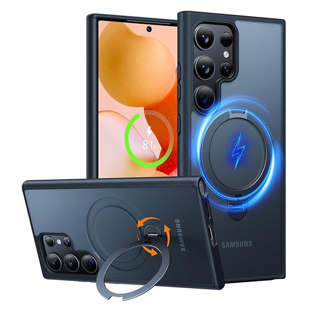 TORRAS Galaxy S24 Ultra 用 ケース【超剛性|360° 回転スタンド × 10 万回開閉耐久】MagSafe対応 米軍規格 縦横両対応 リング付き マグネット搭載 ワイヤレス充電対応 耐衝撃 防指紋 半透明 Ostand Spin ブラック