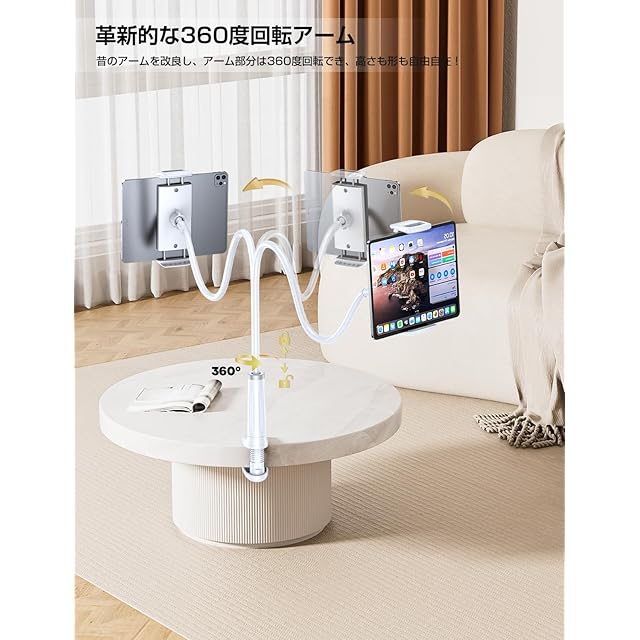 【快適なタブレットライフ】フレキシブルアームは、目線に合わせて細かな調整ができるだけではなく、タブレットを手で持つことのかわりに固定できます。ナイトテーブルやオフィスデスク、ベッドボードなどに挟むことができます。ベッドやソファーで寝ながら、台所で料理を作りながらタブレットが見れます。ハンズフリーのタブレットライフをもっと快適になります