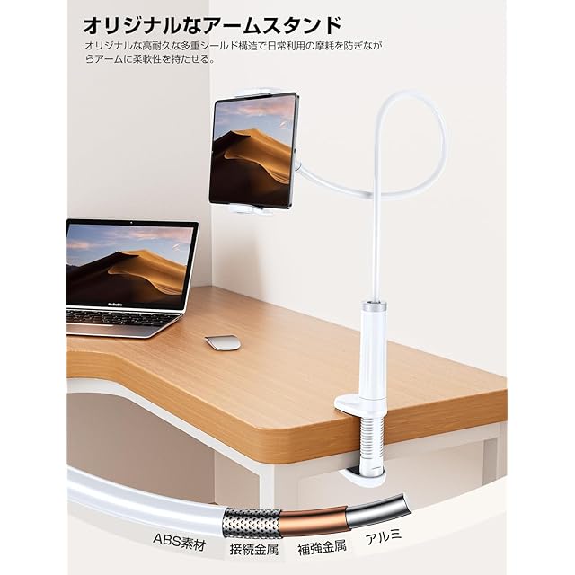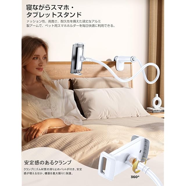 【ダブルグランプ・回転式フレキシブルアーム】タブレット&スマホ 両用 スタンド 全機種対応 iPhone&iPad アームスタンド 寝ながらスマホスタンド 携帯 スマホアーム 360自由回転 土台強化 安定性 フレキシブルアーム付き 柔軟自由調節 仰向け ごろ寝 幅広い互換性 4.7-12.9インチ, ホワイト
