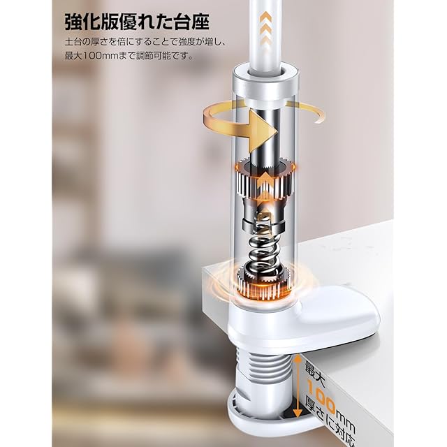 「強化版優れたネジ式台座✧安定感満々」 普通モデルのスマホスタンドは土台のところが弱すぎで壊れ易く、スマホの重さが支えきれなくなる状況が発生いたしましたが、弊店の改良タブレットスタンドは、土台の厚さを倍にすることで強度が増し、割れにくくなっており、荷重に耐えれない問題点を改善しました。取り付けも簡単で、最大65mmまで調節可能です。柔軟で角度の異なるアームスタンドは、様々な高さのニーズに適しています。ホルダー部の両側と上下土台にシリコン滑り止めマットを設けて、スマホやタブレットや家具を傷からきちんと守ります。安定感が増えるほか、土台設置場所を最大限保護できて、傷を付く心配ありません。