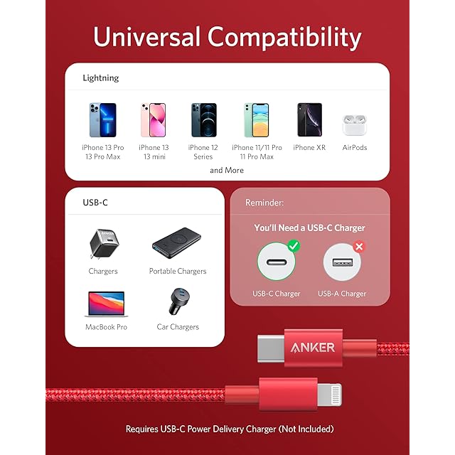 Anker 高耐久ナイロン USB-C & ライトニングケーブル MFi認証 USB PD対応 iPhone 14 / 13 / 12 / SE(第3世代) 各種対応 (1.8m レッド)