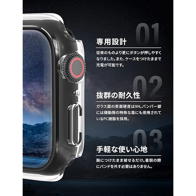 機能性 |正確なカットアウトの保護ケースでアップルウォッチの各ボタンの操作はアップルウォッチ本来の操作感に近く、快適に操作できます。 アップルウォッチ裏のセンサー部分にカバーがない設計なので、保護ケースを装着したままでの充電が可能です。 また、バンド部分に干渉しないカバーデザインでバンドの交換もスムーズにおこなえます。ガラス面には、グレア現象(密着痕)を防止するドット加工を施しております。(100%防ぐものではありません) 腕に着けたままかぶせるだけ。従来の保護ケース同様に何度でも着脱可能。強化ガラスを使用しておりますが、一点に負荷がかかると破損することがあります。特に脱着時、ガラス面を押さえないようご注意ください。保護ケースガラス内側はドット加工が施されている為、お手入れの時など摩耗により傷がつく場合があります。香水、溶剤、洗剤、酸や酸性の食品、虫除け、ローション、日焼け止め、油分、毛髪染料などは本製品及びAppleWatchに悪影響を及ぼす可能性がありますので付着しないようにしてください。ブラック・ホワイト・クリアのカラー展開でApple Watchのデザイン性を損ないません。