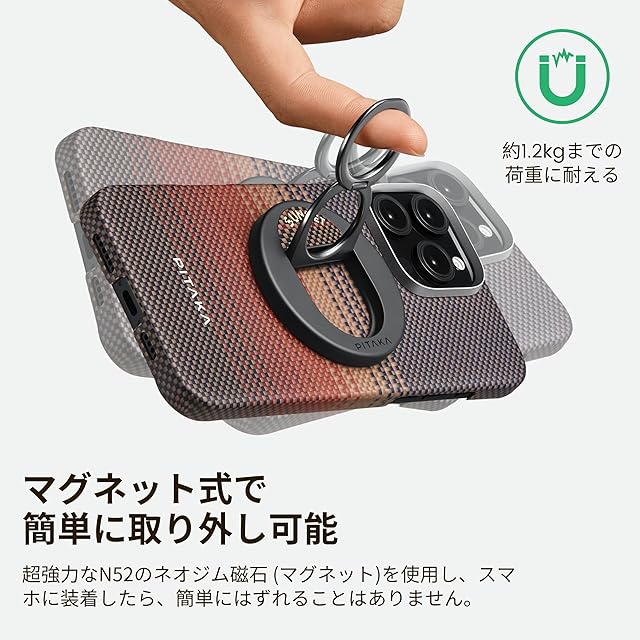 PITAKA MagSafe リング MagEZ Grip マグネット式スマホリング バンカーリング 角度調節可能 スタンド機能付き 600Dアラミド繊維 カーボン風 MagSafe専用 MagEZ Case 2&MagEZ Case 3に最適