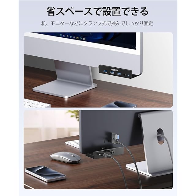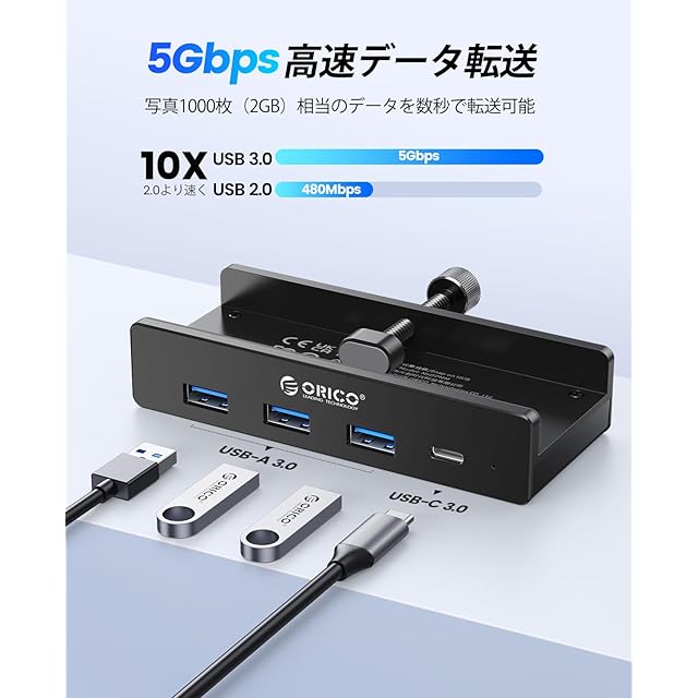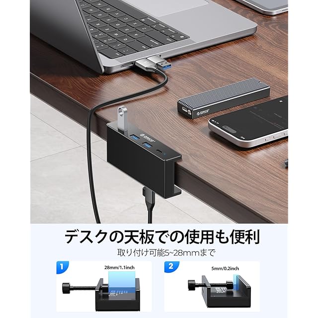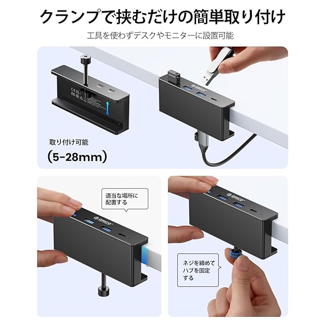 商品名:ORICO USB C ハブ クランプ 固定 usb hub 3.0 4ポート 5Gbps高速転送 USB-C 給電ポート付き(5V/3A) バスパワー/セルフパワー両対応 2-IN-1 1mケーブル付き アルミ クリップ式 USB拡張 USB増設 Windows/Linux/Mac OS対応 テレワー 在宅勤務 ブラック MH4PC