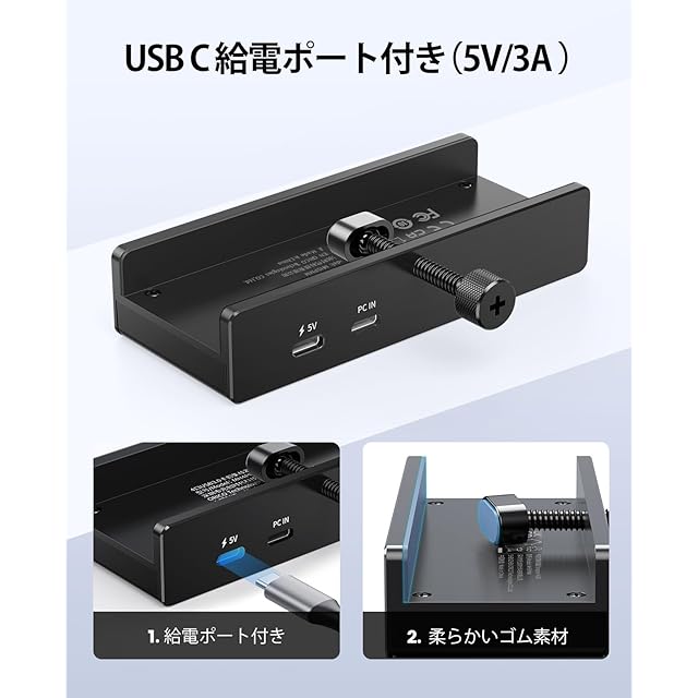 本製品はクランプで机やモニターに取り付けられて固定で、省スペースで設置できるUSB ハブ クリップです。USBポートを抜き差しも安定して片手作業でできます。 USB C ハブ クランプは5~28mmの厚さに対応し、内部にバネを内蔵し、天板などと接触する面には傷を付けにくいシリコンの滑り止めを採用しています。 USB 3.0 Aポートが3個、USB 3.0 Type-Cポートが1個付で合計4台のUSB機器を接続することができるUSBハブです。USB3.2 Gen1(理論値5Gbps)の転送速度に対応しています。 USB HUBには通電確認用のLED付きで状況が一目でわかります。 約1m長でUSB Type-cケーブル(2in1C To A/C)付属して変換アダプタ不要でusb ハブ セルフパワーでもデスク下のPCや昇降デスクでも設置できます。 またusb hub の固定する部分が可動式なところですから、カーブのモニタもしっかり固定できます