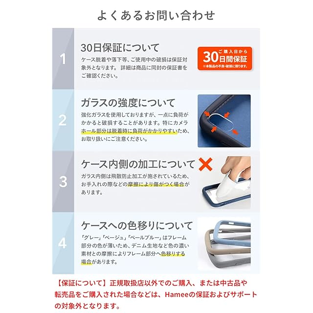 ●本製品ご使用における人体・スマートフォン本体を含む持ち物・データなどの損傷、損失、紛失に対し、弊社は一切の責任を負いかねます。●スマートフォン本体やケースに発熱などの異常がある場合は本製品を外してください。●画面保護フィルムの形状により本製品と併用できない場合があります。●背面カメラでの撮影時に写り込みが起こる場合があります。●本製品内側の飛散防止フィルム加工は摩擦等により傷がつく場合があります。お手入れの際は柔らかい布などで優しく拭いてください。●材質の特性上、折り曲げたり強い衝撃を与えますと破損する恐れがあります。着脱の際など取扱いにご注意ください。●ご使用の充電器や環境によってワイヤレス充電がご利用いただけない場合があります。●ご利用状況・環境、溶剤の使用などにより変色や変質が起きることがあります。●本製品装着やOSアップデートにより、スマートフォンの一部機能が使えなくなる可能性があります。●本製品およびパッケージは改良のため予告なく仕様を変更する場合があります。●記載されている製品名・会社名などは各社の商標または登録商標です。