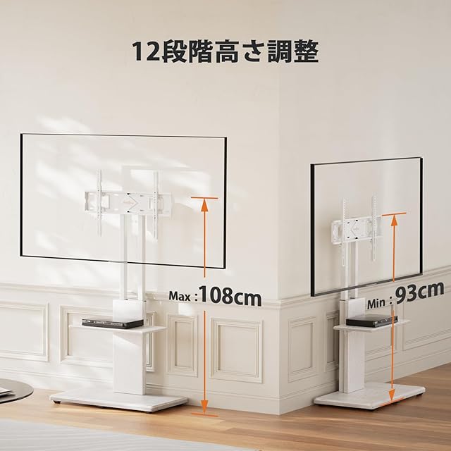 【12段目高さ調節・左右20度首振り】Perlegear 壁掛けtvスタンドは、TVブラケットの取付高さが3段階で、支柱の取付高さが4段階で、合計12段階の高さ調整が可能です。取り付け部中心から台座までの高さを93cmから108cmまで調整できます。テレビの端を軽く振るだけで、左右に20度首を振ることができ、角度を簡単に変えられて便利です。高さ調節・左右首振りが可能で、視野角が広くなり、部屋のさまざまな場所からテレビを観られ、快適に視聴できます。また、木製棚の取付高さが4段階で、台座までの高さを33cmから45cmまで調整できます。