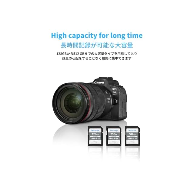 Nextorage NX-F2SEシリーズ UHS-II SDカードは、4K動画の撮影、カメラの高速連写機能のサポート、PCへの高速データ取り込みなど、UHS-IIならではの快適性を実現したスタンダードエディションです。SDビデオスピードクラスV60(最低転送速度: 60 MB/s)に準拠したSDXCカードで、4Kでの高品質動画の撮影や、静止画の連続撮影が必要なシーンで安定したパフォーマンスを発揮します。また、最大280 MB/s の高い読み出し性能をもつため、短時間で写真や動画をPCなどに取り込むことができ、データのチェックや編集、共有といった撮影後の作業もスムーズに行うことができます。最大512GBまでの容量ラインアップを用意しており、残量の心配をすることなく撮影に集中できます。
