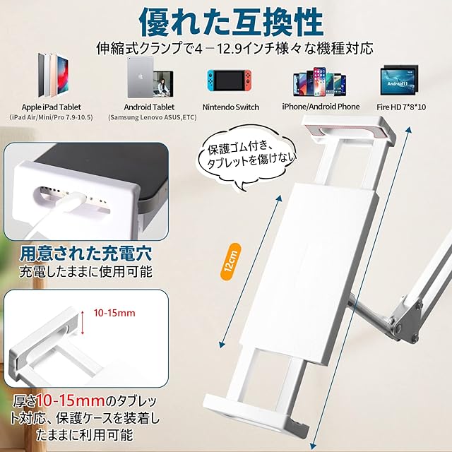 【4.5-12.9インチ機種対応・充電穴用意】ipad スタンド の伸縮式クリップにより、12-26cmまで拡張可能し、4.5-12.9インチの全てiPad/iPadPro/iPhone/android/surface/Kindle/Fire HD8/Switch などさまざまな機種に対応します。寝室での動画鑑賞、YouTubeを見て、在宅勤務、オンライン授業など、どんな場所でもご好みのように使用可能です。それ以外、クリップ両側は充電穴を用意されて充電したままに利用可能します。また、クリップは1.5cm厚さのタブレットが対応し、保護ケースを装着したままに利用可能です。