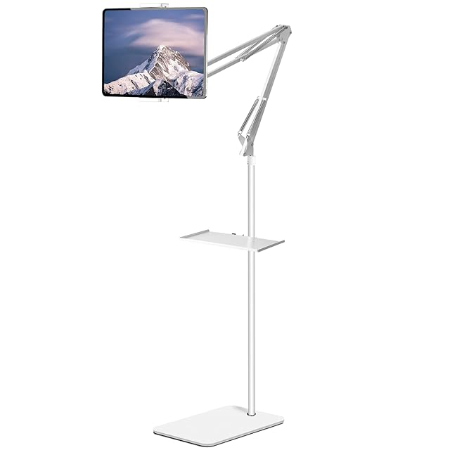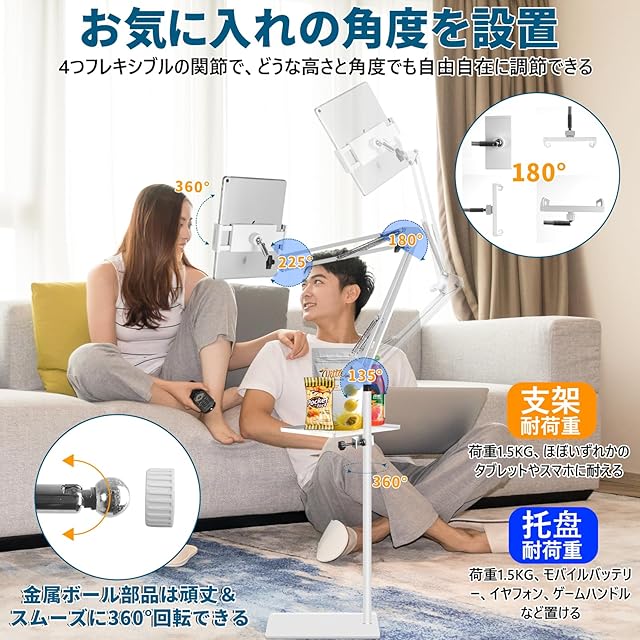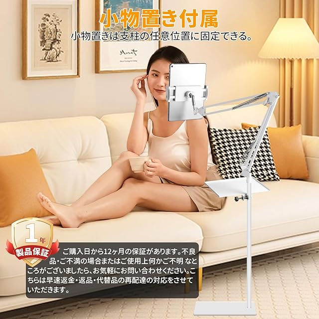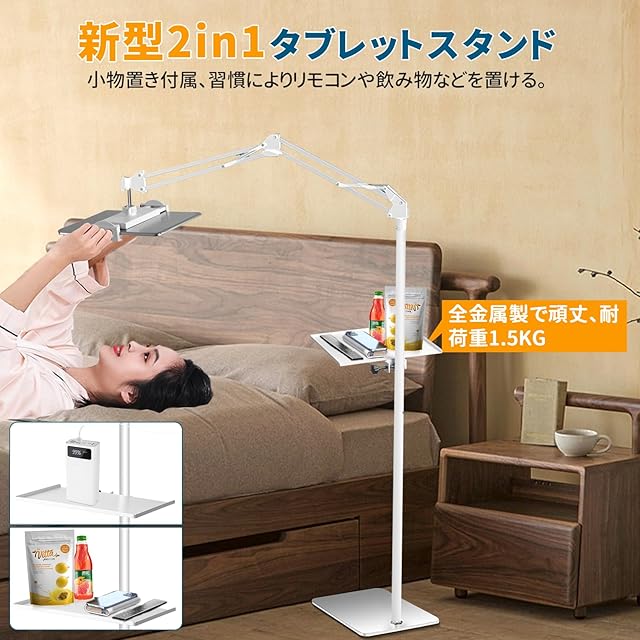 【小物置き付き タブレットスタンド】寝室での動画鑑賞、YouTubeを見て、在宅勤務、オンライン授業など、どんな場所でもご好みのように使用可能です。小物置きも付属し、耐荷重は1.5kg、モバイルバッテリー、イヤフォン、ゲームハンドル、コーヒー、おやつなど置けることができます。小物置きは支柱の任意位置にネジで簡単に固定でき、不用の時に取り外して良いです。本タブレットスタンドは貴方の両手を完全に解放させ、ベッドに寝ながらリラック時間を楽しめます。