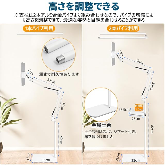 【高さ調整・自由移動・様々場合に大活躍】 タブレット スタンド の支柱は2段式のパイプにより組み合わせなのでパイプ増減により高さを調整できます。どうな身長の方でも最適な目線を合わせます。特に全身自撮りや、生放送に最適です。本体重は2.6kgだけ、楽に移動できます。オフィス、寝室、キッチン、バスルームなどいろいろな場所に適用。日常映画鑑賞がもちろん、エクササイズ、店頭、展示会ブース、受付の案内などに幅広くお使いいただけます。