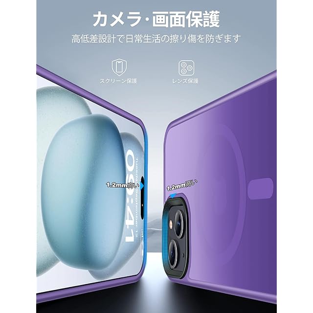 アイホン15の曲線に従って高低差を設計。液晶画面より1.2mm高く、カメラレンズより1.5mm高く、机などの平面に置いても傷付く心配はない。※本製品は6.1インチしか対応できないですから、ご購入する前サイズを確認ください。