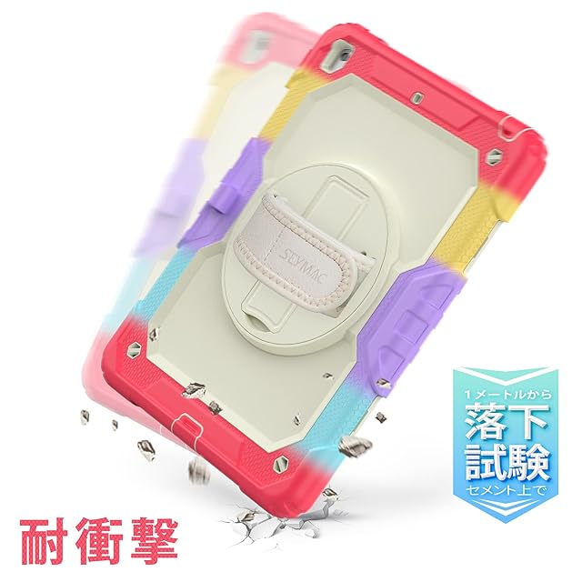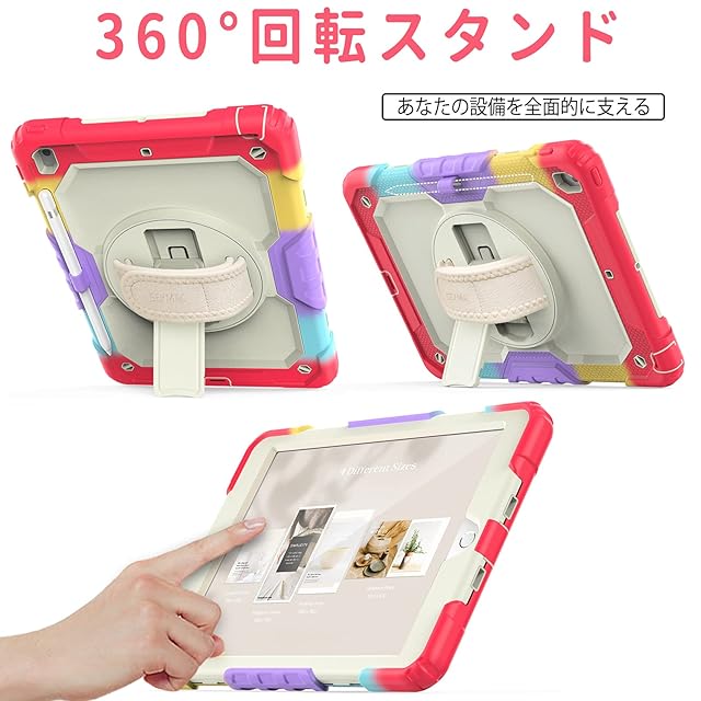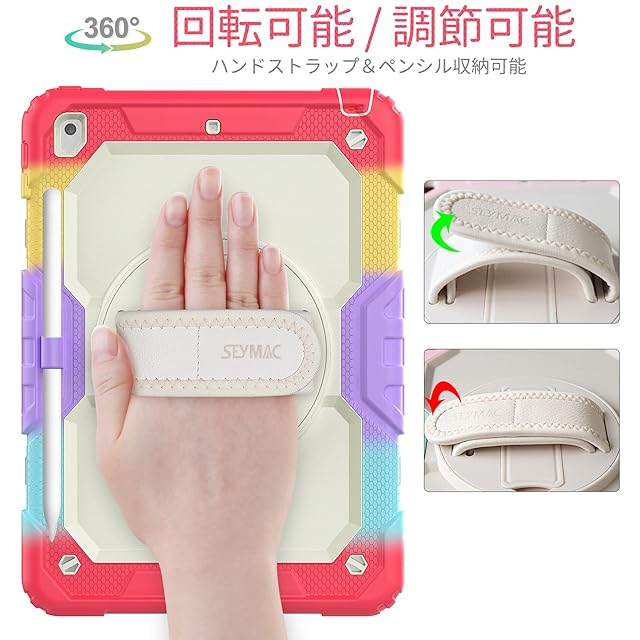 SEYMAC stock iPad 10.2インチ 第9世代/第8世代/第7世代 ケース 耐衝撃 保護フィルム付き ペン収納 360°回転スタンド ハンドストラップ ショルダーストラップ 全面保護カバー (色とりどり+レッド)