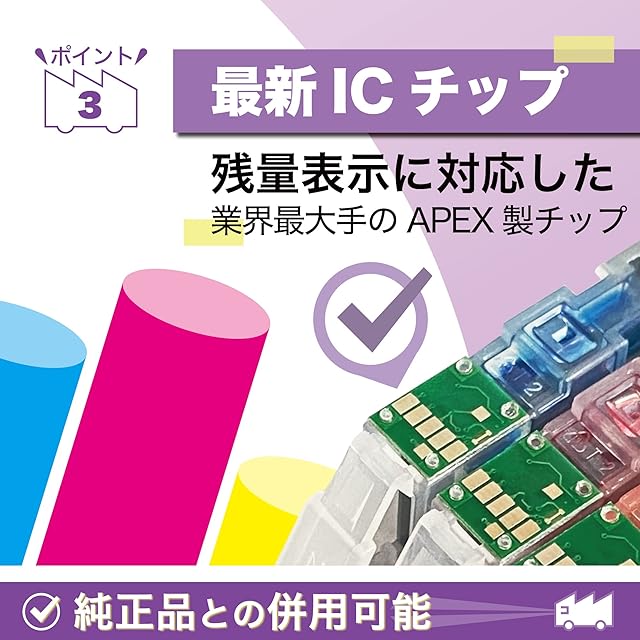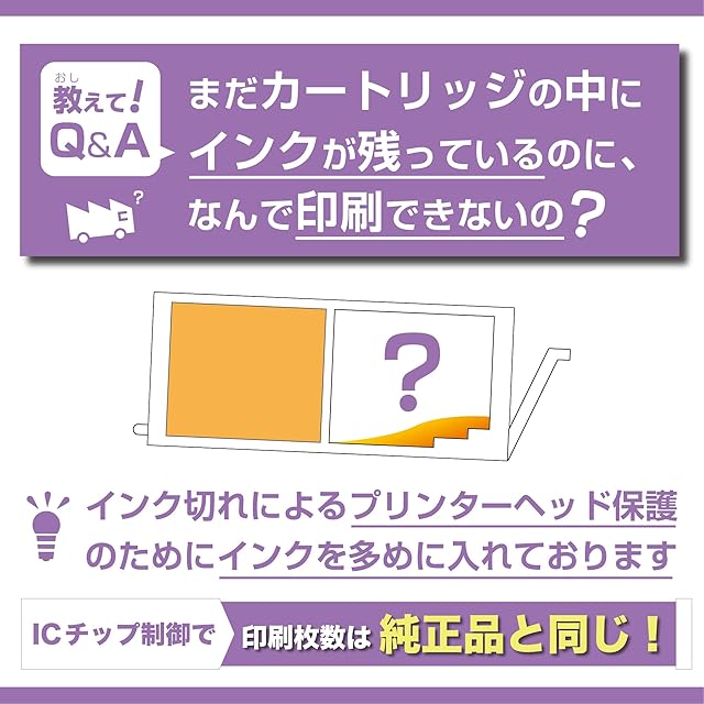 【本製品の特長】業界最大手のICチップ、日本製活性剤採用で目詰まりの原因を軽減したインク。顔料インクは文字を「くっきり」と、染料インクは写真紙になじみがよく高発色です。保存にも適している個包装でのお届けです。※本製品は純正品ではありません。純正品同様にご利用いただける互換インクカートリッジです。