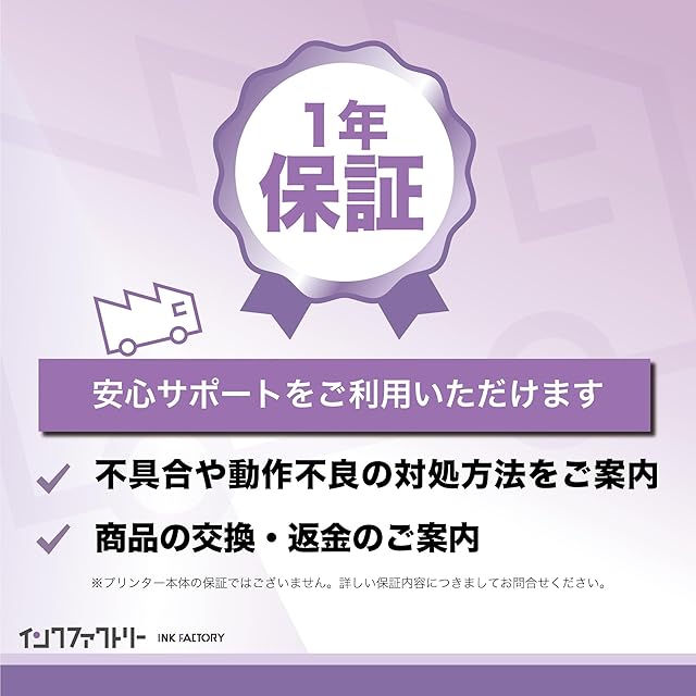 <b>【想いをとどける 安心の日本ブランド インクファクトリー】</b><br> 工場+トラックをイメージしたロゴマーク、インクファクトリーは印刷を通して皆さまの想いをつなげ、お届けするお手伝いをします。<br> <br><b>当店の商品について</b> <br>本製品は純正インクではございません。純正品同様にご利用いただける、互換インクです。 <br>*ICチップ:最新チップを採用!インクの残量表示も問題なく行えます。 <br>*インク:日本製添加剤を加え、カスレ原因となる目詰まりを起こしずらい設計になっております。 <br>*国際品質基準:国際規格ISO141001、ISO19001認証だけではなく欧州のRoHS指令、REACH規則、CEマークを取得した工場で製造。<br> <br><b>安心サポート</b> <br>安心の商品1年!ご購入いただいた日より1年間の期間を設けております。 <br>またご購入に不安がある場合、店舗にお問い合わせください。知識と経験が豊富な日本人スタッフが丁寧にサポートいたします。 <br>(平日10:00-17:00に順次対応、日本語のみ)