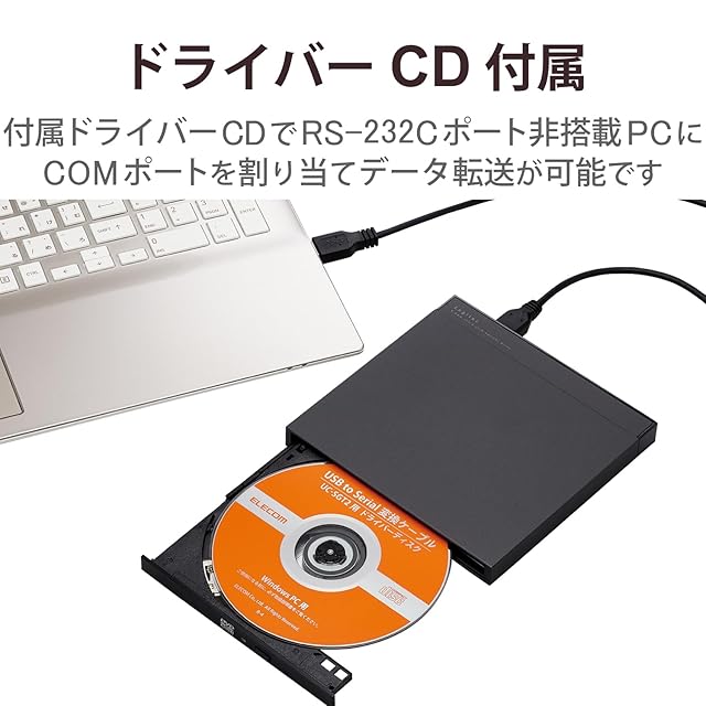 付属のドライバーCDからドライバーをインストールすることで、RS-232C(D-Sub9pin)ポート非搭載のパソコンにCOMポートを割り当て、データ転送が可能です。
