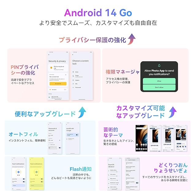 【最新Android 14搭載】Blackview Wave8Cは、Android 14Goシステムを採用。優れた互換性とパフォーマンスで、快適なスマートフォン体験を実現します。高度なデータ保護機能により、不要なアプリからのセキュリティリスクを軽減。今後数年間も時代に遅れることなく、安心してご利用いただけます。※ご注意:本製品はNFCおよびFelica機能非対応のため、個人番号カードの利用はできません。