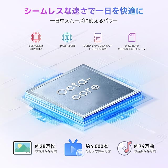 【6GB RAM+64GB ROM&最大2TB拡張可能】Blackview Wave8Cは、RAM拡張機能により最大6GBまで拡張可能。マルチタスクやゲームプレイがよりスムーズに楽しめます。64GBの内蔵ストレージは最大2TBまで拡張可能なので、アプリやデータの保存に困ることはありません。さらに、最大2.2GHzのオクタコアプロセッサを搭載し、高速処理でゲームや日常の操作が快適に。応答性も大幅に向上し、ストレスのない使い心地を実現します。