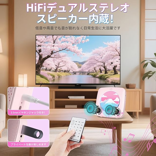 【高音質スピーカー内蔵&リモコン付き】Y01 CDプレイヤーは、Hi-Fiスピーカーを内蔵しており、日常生活の中で低音域や高音域がひびくことなく、音楽そのものを楽しめます。 また、3.5mmヘッドフォン(別売)でプライベートな音楽を楽しめます。更に、付属のリモコンで座ったままで操作できるので、歩き回ることなくいつでも楽しむことができます。ご注意:CD/USBモードで3.5mmイヤホンを差し込むとCDプレーヤーのスピーカー が自動的に停止されます。