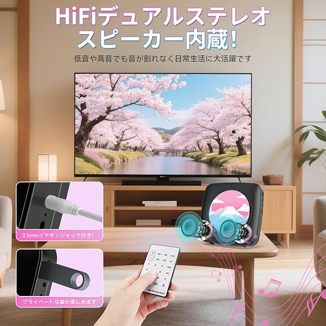 【高音質スピーカー内蔵&リモコン付き】Y01 CDプレイヤーは、Hi-Fiスピーカーを内蔵しており、日常生活の中で低音域や高音域がひびくことなく、音楽そのものを楽しめます。 また、3.5mmヘッドフォン(別売)でプライベートな音楽を楽しめます。更に、付属のリモコンで座ったままで操作できるので、歩き回ることなくいつでも楽しむことができます。ご注意:CD/USBモードで3.5mmイヤホンを差し込むとCDプレーヤーのスピーカー が自動的に停止されます。