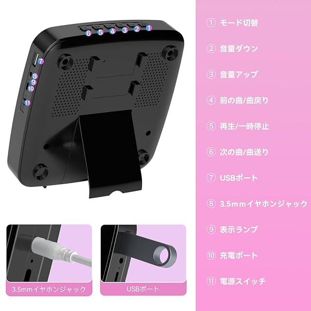 【4つ再生モード&様々な場所に適用】全曲リピート/1曲リピート/ランダム再生/順番再生の4つのプレイ・モードに加え、本CDプレーヤーは、子供や語学学習者の言語学習に最適なA-Bリピート機能も備えています。更に、付属のUSBケーブルでコンピューター、USBアダプター、ポータブルバッテリーに簡単に接続して給電でき、お部屋、キャンプ・パーティー、子供向け教育や胎児教育、贈り物、喫茶店など多くなシーンに適用されます。