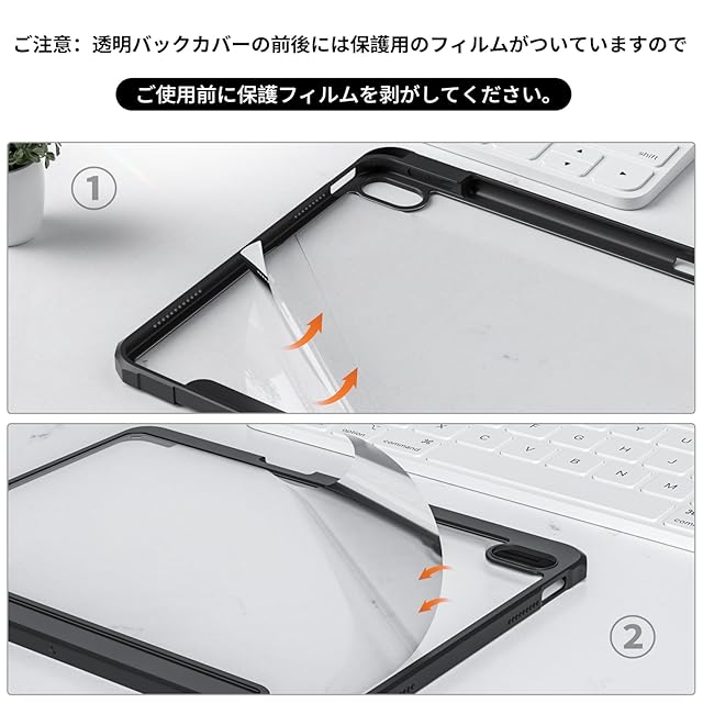 クリアバックカバー: 柔軟なTPUバンパーと透明なハードPCバックシェルで作られており、デバイスの本来の美しさを見せます。iPadを傷や衝撃からしっかりと保護しながら、取り付けや取り外しが簡単です。 (注意:透明バックカバーの前後には保護用のフィルムがついていますので、ご使用前に保護フィルムを剥がしてください。)