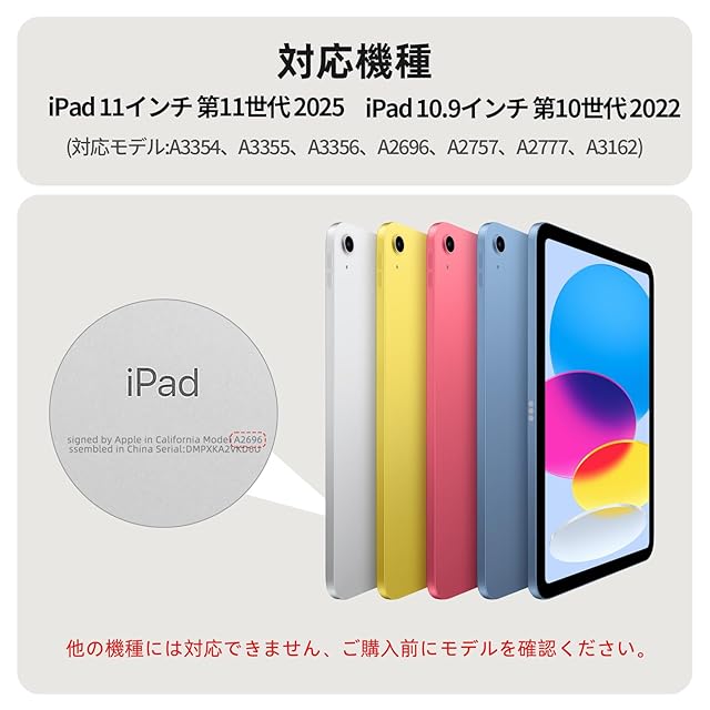 互換性: iPad第11世代(11インチ、2025モデル)、iPad第10世代(10.9インチ、2022モデル)用に設計されています。モデル:A3354/A3355/A3356/A2757/A2777/A2696。 注意: モデル番号を確認するには、iPadの背面下部を確認してください。