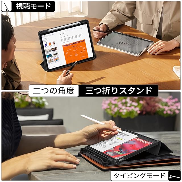 2つのモード: 三つ折りフロントカバーは、デバイスを二つの角度で支えて、最適な視聴とタイピングのニーズを満たすことができます。