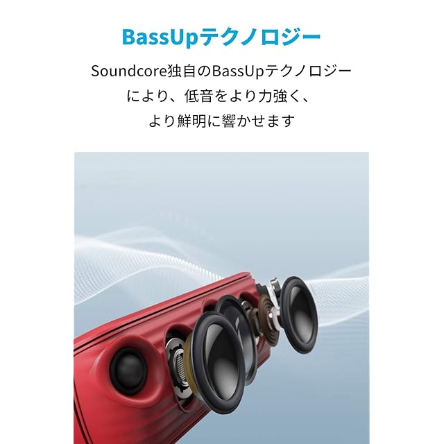 大音量&強化された低音:2つの超高周波ツイーターに加え、2つのネオジウムウーファーと2つのパッシブラジエーターを搭載し、最大30Wの豊かなサウンドをより鮮明に響かせます。さらにSoundcore独自のBassUpテクノロジーにより、体全体に響く迫力と深みのある低音をお届けします。