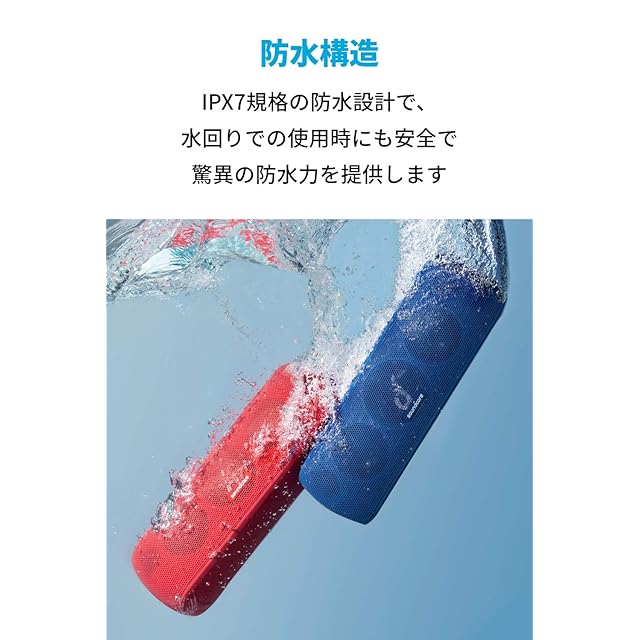 IPX7防水規格:最長30分間であれば水深1mまで沈めても操作可能なIPX7の防水設計で、海やプール、お風呂場等でも気軽にお気に入りの音楽を堪能できます。