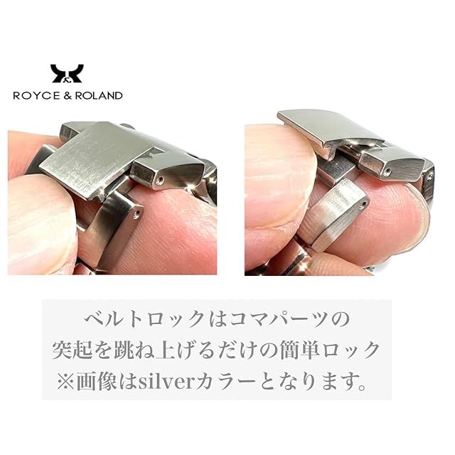 【全機種対応】対応機種:Apple Watch Series 10 , 9 , 8 , 7 , 6 , 5 , 4 , SE ,Ultra 2.1 /サイズ:40 . 41 . 42 . 44 . 45 . 46 . 49mm対応 / ご希望のサイズをお選びください。 ※コマ調整でサイズ調整可能 / 付属品:輸送保護用ボックス※コマ調整器とアップルウォッチ本体は付属しません。1コマあたり8.5mm調整可能。最大6コマ=5cmの調整が可能。 / ご注意:ご自身でのコマ調整の際は、破損、お怪我にご注意ください。コマ調整器を使用したことがなくご心配な方は時計店での調整をおすすめいたします。【高級感溢れるバンドで華やかに】動くたびにブレスレットが輝き、適度な重みが高級感を演出します。手首につけるだけでオシャレ度がグッと上がり、ビジネスからカジュアルな場面まで幅広いシーンでお使いいただけます。【ステンレススチールを採用】合金ではなくステンレススチールを用いたチェーンブレスレット。ステンレススチールの磨き上げられた美しいデザインが特徴で、チェーンはポリッシュ加工、コマは高品質サテン仕上げとなります。リング状のチェーンは通気性も抜群です。【ギフトやプレゼントに】Apple Watchをおしゃれに彩る人気のステンレスチェーンベルト。シルバーアクセサリーとしても使用でき、ご家族や友人、恋人などへ贈る誕生日、お祝いのギフトなど、プレゼントにもおすすめです。【硬めの作りで落下防止】落下を防止するため、ロック式の留め具は硬めの作りになっています。 使用していく中で次第に開閉しやすくなります。※コマ調整は、必ずベルト側面のピン穴が窪んでいる方からベルト裏面の矢印の方向へ向けて針を刺して下さい。反対側からは脱落防止のため抜けない構造となっております。※コマ調整器は別売りとなります。【必ずお読みください】 1.ステンレスは金属アレルギーを起こしにくい素材ですが、体質によって、かゆみ・かぶれを生じる場合がありますので、皮膚に異常を感じたときは、ご使用をお止めいただき専門医にご相談ください。金属アレルギーが心配な方は、皮膚科にてパッチテストなどのアレルギーテストを受けられることをおすすめします。?ご購入後のアレルギー反応に関しまして責任は一切お受け出来かねます。あらかじめ、ご了承ください。金属アレルギーの方はご使用しないで下さい。 2.力仕事や激しいスポーツをする時、就寝時や幼児の世話をする時など、身体に危害を及ぼす場合がありますのでジュエリーをはずしてください。 3.サウナ等高温の場所、あるいはスキー場等極寒地でのピアスなどのジュエリーの使用は、火傷、凍傷の原因となる場合がありますので、着用しないでください。【商品タグについて】製造時期により、製造委託工場のロゴ(handodo)が記載されていることがございますが、ROYCE&ROLANDの商品であり商品品質などこれまでと変わるものではございません。2023年11月以降に製造されるものから全て再度ROYCE&ROLANDに統一されます。