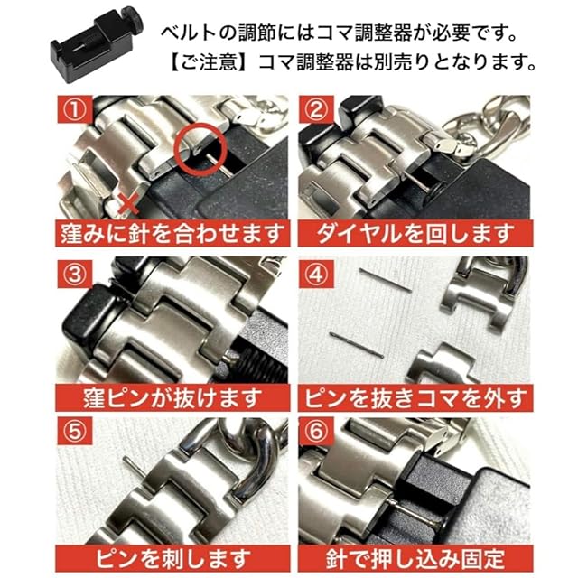 【硬めの作りで落下防止】落下を防止するため、ロック式の留め具は硬めの作りになっています。 使用していく中で次第に開閉しやすくなります。※コマ調整は、必ずベルト側面のピン穴が窪んでいる方からベルト裏面の矢印の方向へ向けて針を刺して下さい。反対側からは脱落防止のため抜けない構造となっております。※コマ調整器は別売りとなります。