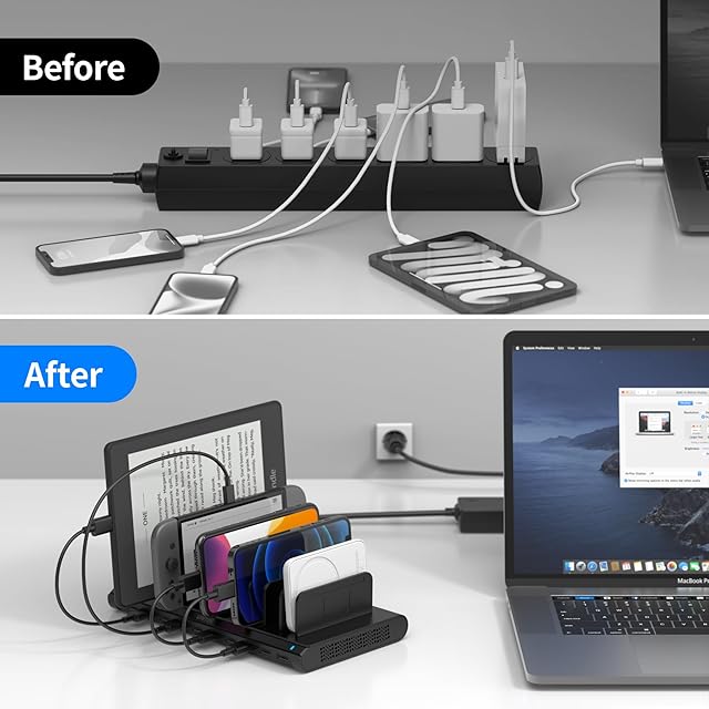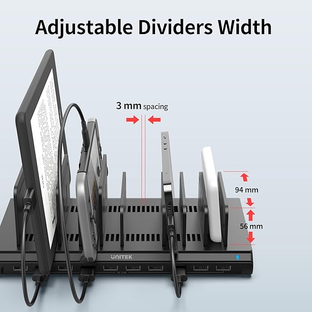 【お好みにより間隔調整可】仕切り板を1.5mm単位で好きな幅で自由に調整できます。差し込みもとても簡単で保護カバーを取らずにスマホなどを置いたまま充電ケーブルを接続できます。Unitek USB充電ステーションで乱雑していた机の上をスッキリとした空間を作り出すことができます。