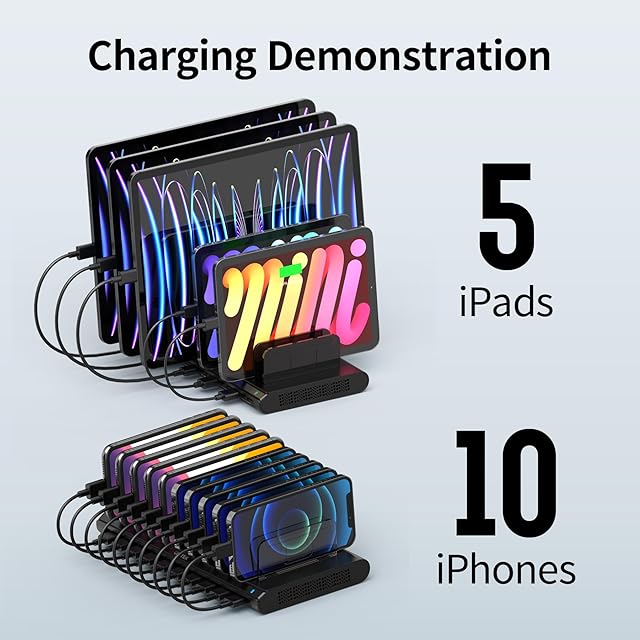 【10台同時充電タイプ】付属の仕切り板(高い板5枚+低い板6枚)で最大10台のモバイル機器をキレイに置けます。スマートIC内蔵で充電中、USBデバイス端末に適した最適な電圧を自動的に調整できます。iPadなら最大で5台まで充電できます。(ご注意:充電ケーブルは別売りです。)