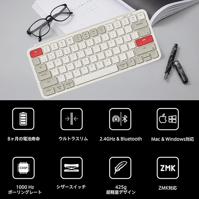 Keychron B1 Proは、シザースイッチを採用し、軽量、超薄型のワイヤレスキーボードで、1,200時間の長時間駆動を実現。2.4GHzワイヤレス、Bluetooth、有線モードに対応し、スマートフォン、タブレット、PC、Macに簡単に接続できます。ZMKのカスタマイズ機能により、自宅、オフィス、旅行など、用途に合わせた設定が可能です。また、シリコンカバーが付属します。
