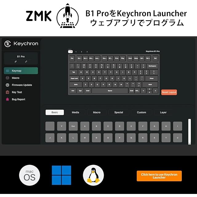 ウェブアプリで任意のキーをプログラム - MacOS、Windows、Linuxを問わず、Keychron Launcherウェブアプリ(ダウンロード不要)または最新のChrome、Edge、Operaブラウザ上のZMKファームウェアで任意のキーとマクロをリマップできます。