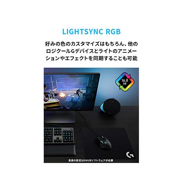 【1680万色RGB】LIGHTSYNCテクノロジーとG HUBにより、RGBライトを約1,680万色から選んでカスタマイズ。セットアップをパーソナライズしたり、他のGギアと同期も可能
