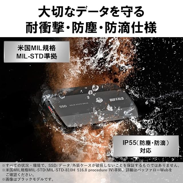 【持ち運びも安心】MIL規格準拠の耐衝撃設計に加え、IP55準拠の防塵・防滴設計。屋外での使用時にも大切なデータを守る。