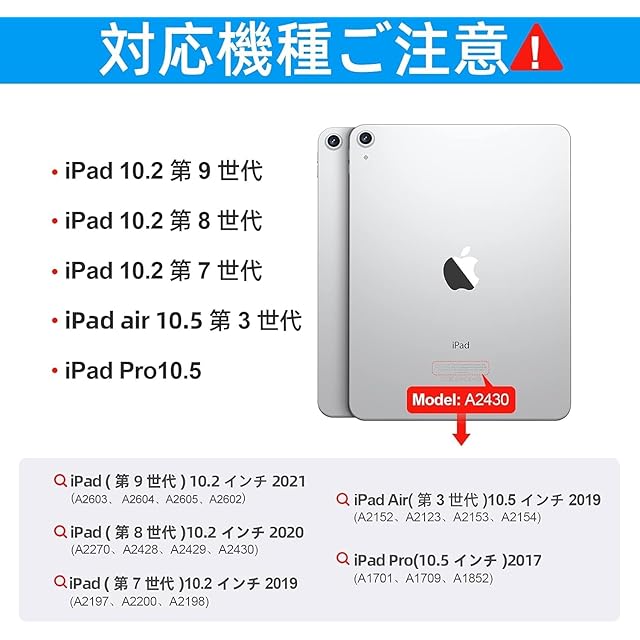 【対応機種】iPad 第9世代 10.2(2021年モデル:A2602、A2603、A2604、A2605)*iPad 第8世代 10.2(2020年モデル:A2270、A2428、A2429、A2430)*iPad 第7世代 10.2(2019年モデル:A2197、A2200、A2198) *iPad Air3 10.5(2019年モデル:A2152、A2123、A2153、A2154) *iPad Pro 10.5(2017年モデル:A1701、A1709、A1852)に対応しています。ご注文前にアイパッド裏面のモデルを確認ください。ご注意:本製品はiPadとApple pencilを含めません。