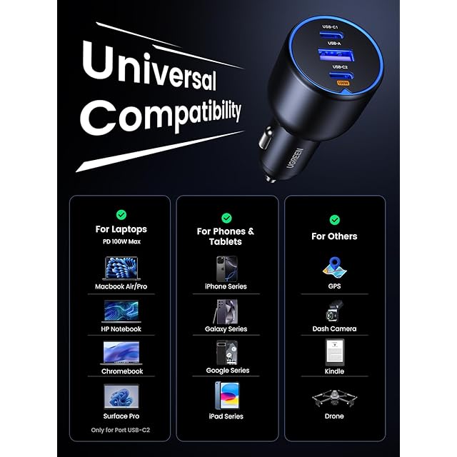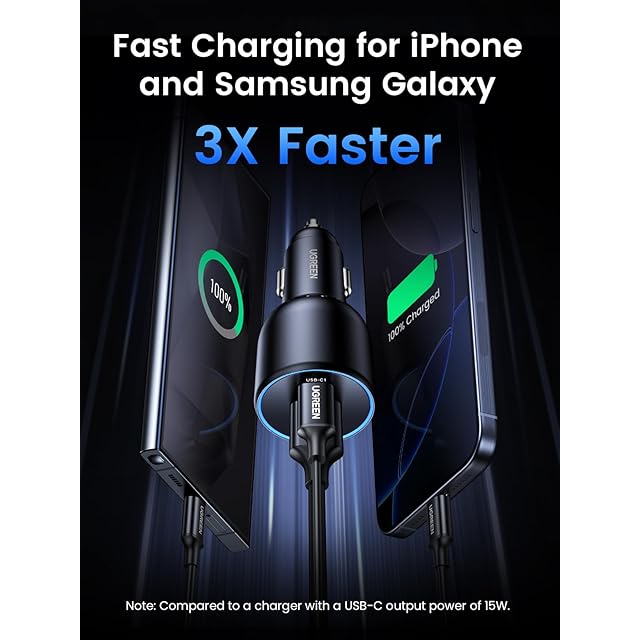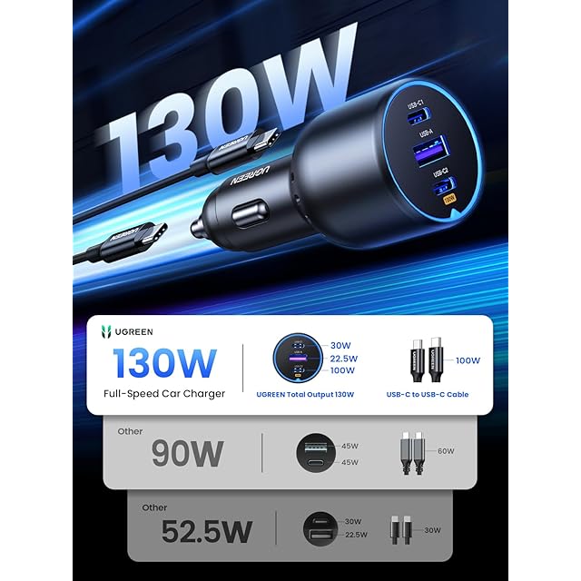 UGREEN 130W シガーソケット usb-c カーチャージャー 3ポート【PD 100W/30W+SCP 22.5W】PD3.0/QC4.0/PPS対応 100w 充電器 しがーソケット usb 急速充電器 iPhone 16/15/14/13, Galaxy, iPad, MacBook,ラップトップなどに対応-100W USB C-USB C 充電ケーブル付き | TREND DESIGN 家電専門店