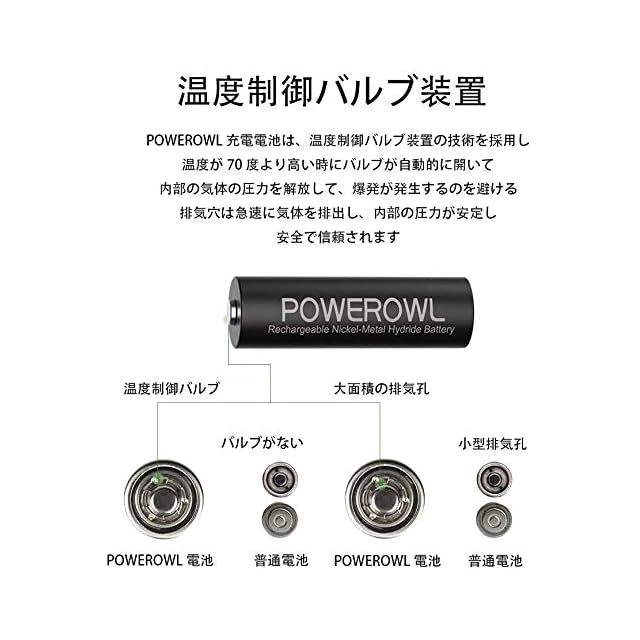 POWEROWLの単3単4形充電式ニッケル水素電池は、長時間使用可能な超大容量の2800mAh+1000mAhを誇り、電気機器に害を及ぼすことのない安定した電圧1.2Vで動作します。独特の低分解技術により、1200回の循環使用が可能で、通常の乾電池1200本と同じ作用をしますが、経済的で耐久性があります。また、自放電抑制技術により、通常3年後には80%以上の電気量を保存することができます。様々な子供のおもちゃや電子機器に互換性があり、低温環境でも正常に使用できます。環境に配慮したデザインで、Hg/CD/Pbなどの有毒な重金属要素を含みません。サイズは9cm×11cm×1.6cmで、16個パックで販売されています。使用後は、電池を完全に充電し、2か月ごとに充電することで、長期保存が可能です。